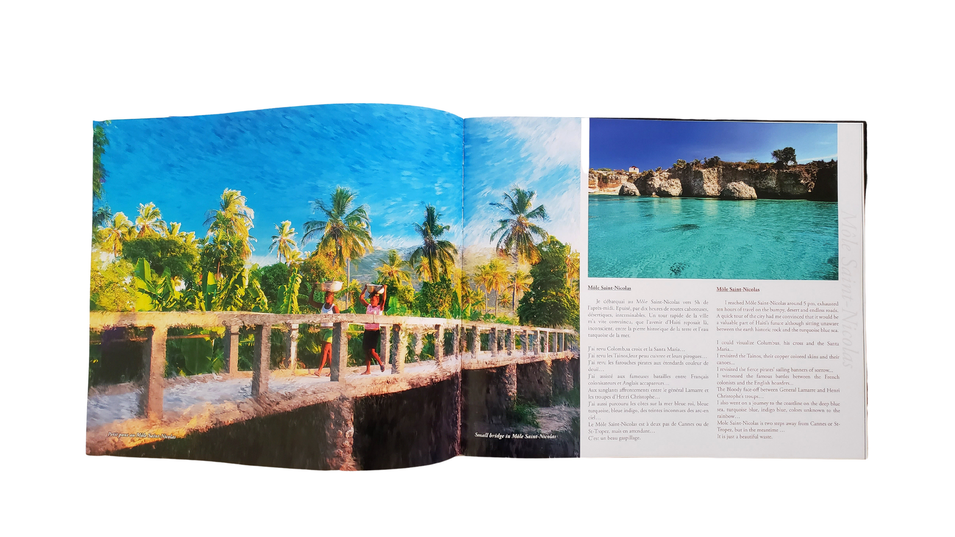 Haiti: Quand La Lentille Se Fait Palette' (French) translates into 'Haiti: When (Photo) Lenses become (a Painter's) Palette' is a dual language French book that includes an accompanying English translation. This oversized hardcover book features over 140 stunning photographs shot in Haiti's countryside by Monsieur Henri (Henri Cayard). This book is beautifully packaged in a hardcover sleeve. Many of the 140-plus vibrant colored photographs are accompanied by descriptive titles, texts and articles. This book is a Must-own for anyone who has a love for Art, Photography, Nature, Travel, Humanity and Haiti.